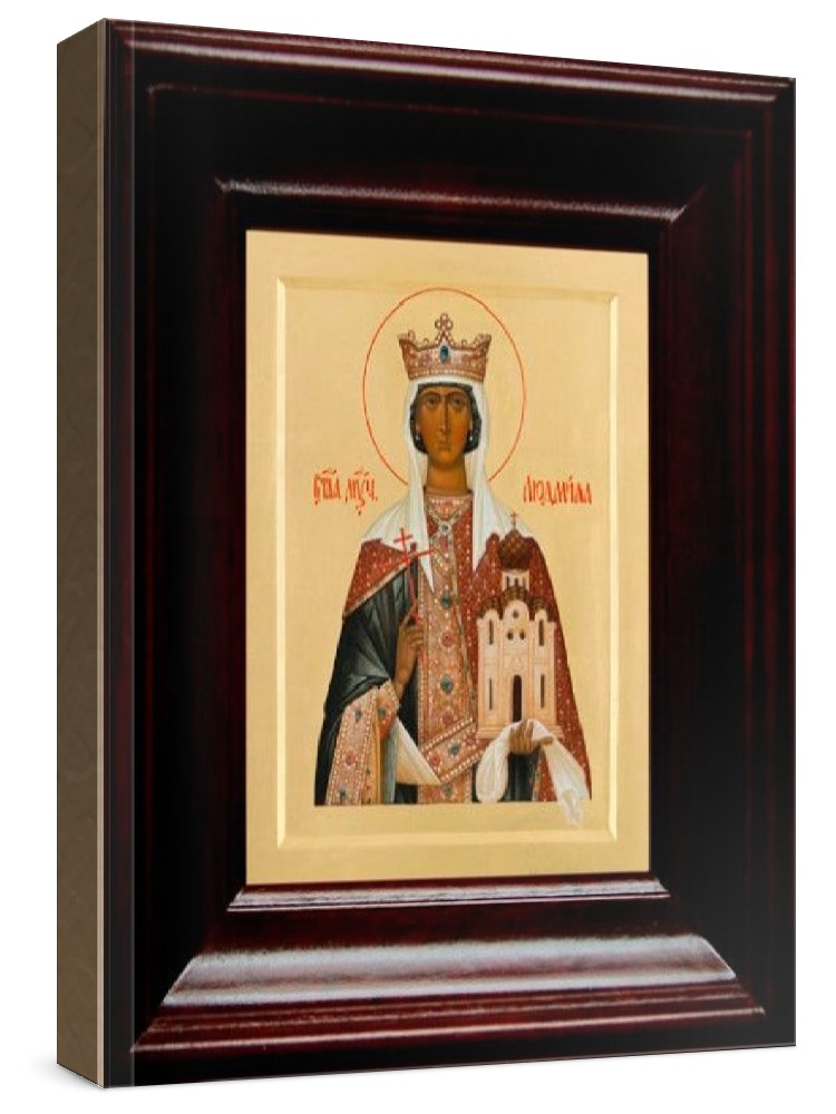 Икона людмила чешская (21х24), простой киот. Лик нанесен методом шелкографии на цельную липовую доску, покрытую левкасом (специальным грунтом под живопись). Использованы минеральные (природные) краски. Размер иконы без киота (см): 13х16, с киотом: 21х24. Киот (рамка) выполнен из березы. Икона освящена.