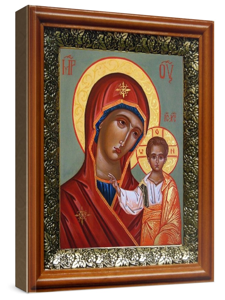 Казанская икона бм (19х22), светлый киот. Икона выполняется на заказ. Срок изготовления - 5-10 дней. Лик нанесен методом шелкографии на цельную липовую доску, покрытую левкасом (специальным грунтом под живопись). Использованы минеральные (природные) краски. Размер иконы без киота (см): 13х16, с киотом: 19х22. Киот (рамка) выполнен из березы и украшен басмой (узор из черненой меди в виде виноградной лозы). Икона освящена.