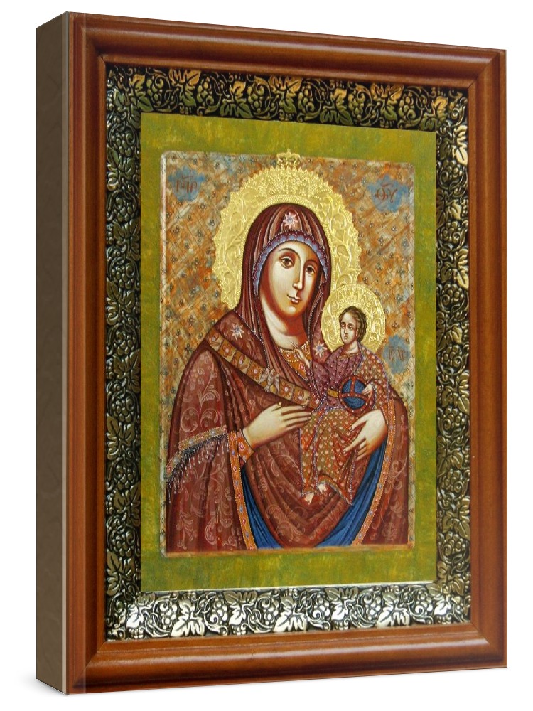 Вифлеемская икона бм (19х22), светлый киот. Икона выполняется на заказ. Срок изготовления - 5-10 дней. Лик нанесен методом шелкографии на цельную липовую доску, покрытую левкасом (специальным грунтом под живопись). Использованы минеральные (природные) краски. Размер иконы без киота (см): 13х16, с киотом: 19х22. Киот (рамка) выполнен из березы и украшен басмой (узор из черненой меди в виде виноградной лозы). Икона освящена.