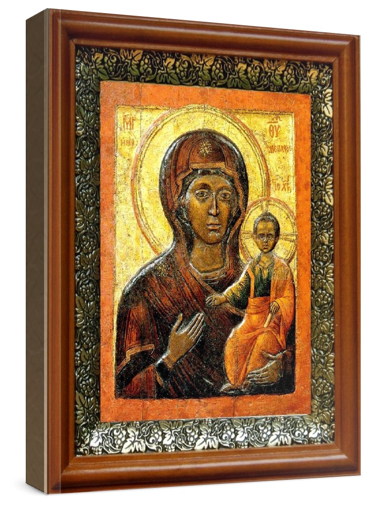 Влахернская икона бм (19х22), светлый киот. Икона выполняется на заказ. Срок изготовления - 3-7 дней. Лик нанесен методом шелкографии на цельную липовую доску, покрытую левкасом (специальным грунтом под живопись). Использованы минеральные (природные) краски. Размер иконы без киота (см): 13х16, с киотом: 19х22. Киот (рамка) выполнен из березы и украшен басмой (узор из черненой меди в виде лозы). Икона освящена.