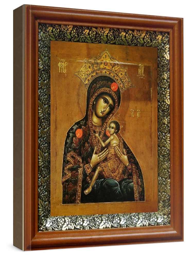 Арапетская икона бм (19х22), светлый киот. Икона выполняется на заказ. Срок изготовления - 3-7 дней. Лик нанесен методом шелкографии на цельную липовую доску, покрытую левкасом (специальным грунтом под живопись). Использованы минеральные (природные) краски. Размер иконы без киота (см): 13х16, с киотом: 19х22. Киот (рамка) выполнен из березы и украшен басмой (узор из черненой меди в виде виноградной лозы). Икона освящена.