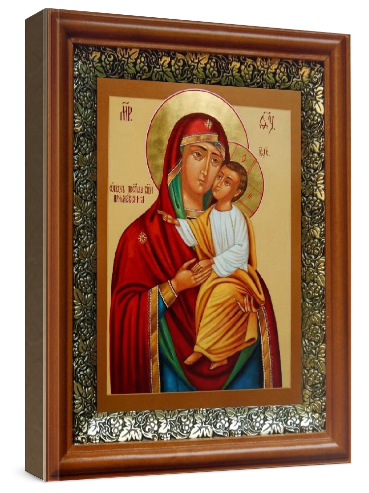 Пряжевская икона бм (19х22), светлый киот. Икона выполняется на заказ. Срок изготовления - 2-5 дней. Лик нанесен методом шелкографии на цельную липовую доску, покрытую левкасом (специальным грунтом под живопись). Использованы минеральные (природные) краски. Размер иконы без киота (см): 13х16, с киотом: 19х22. Киот (рамка) выполнен из березы и украшен басмой (узор из черненой меди в виде виноградной лозы). Икона освящена.