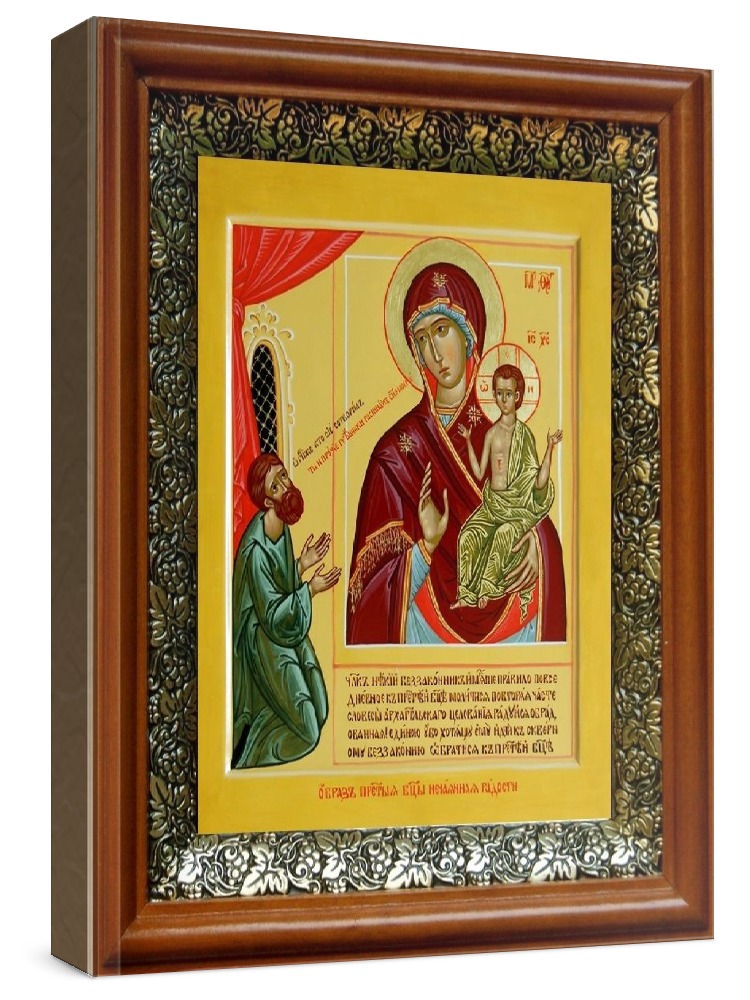 Икона нечаянная радость (19х22), светлый киот. Икона выполняется на заказ. Срок изготовления - 2-5 дней. Лик нанесен методом шелкографии на цельную липовую доску, покрытую левкасом (специальным грунтом под живопись). Использованы минеральные (природные) краски. Размер иконы без киота (см): 13х16, с киотом: 19х22. Киот (рамка) выполнен из березы и украшен басмой (узор из черненой меди в виде виноградной лозы). Икона освящена.