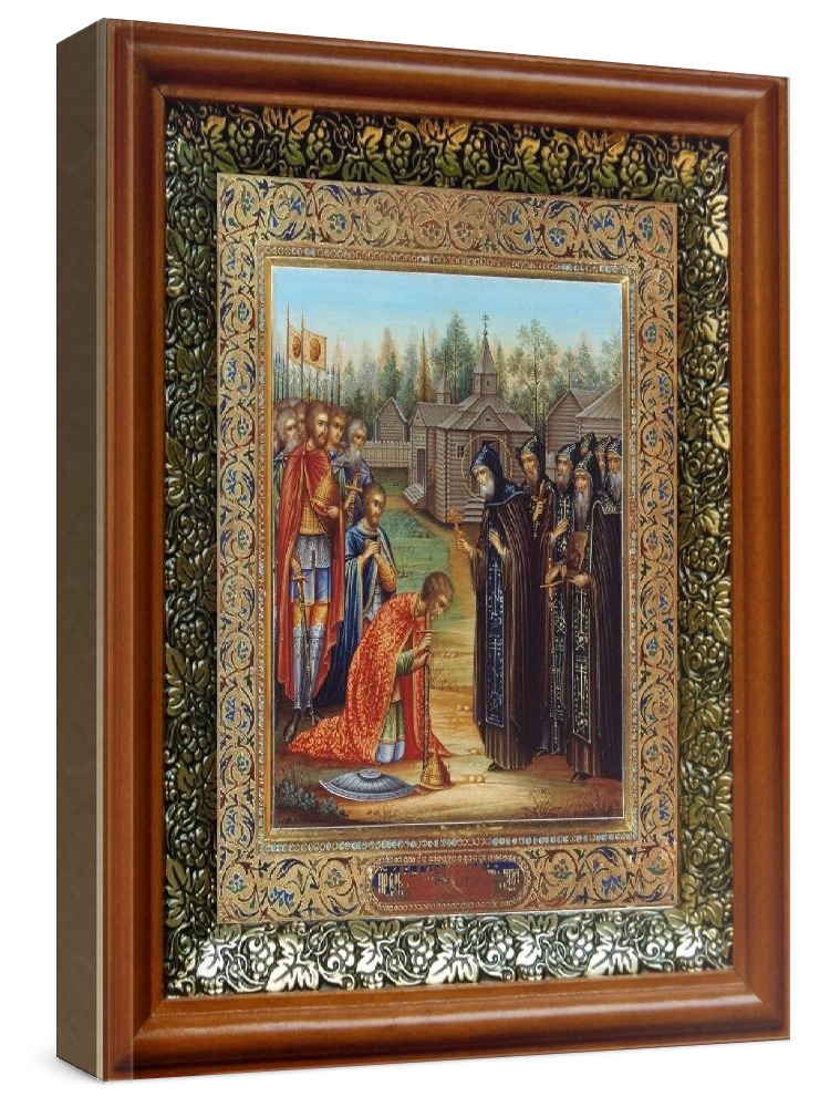 Икона сергий радонежский благословляет дмитрия на куликовскую битву (19х22. Икона выполняется на заказ. Срок изготовления - 2-5 дней. Лик нанесен методом шелкографии на цельную липовую доску, покрытую левкасом (специальным грунтом под живопись). Использованы минеральные (природные) краски. Размер иконы без киота (см): 13х16, с киотом: 19х22. Киот (рамка) выполнен из березы и украшен басмой (узор из черненой меди в виде виноградной лозы). Икона освящена.