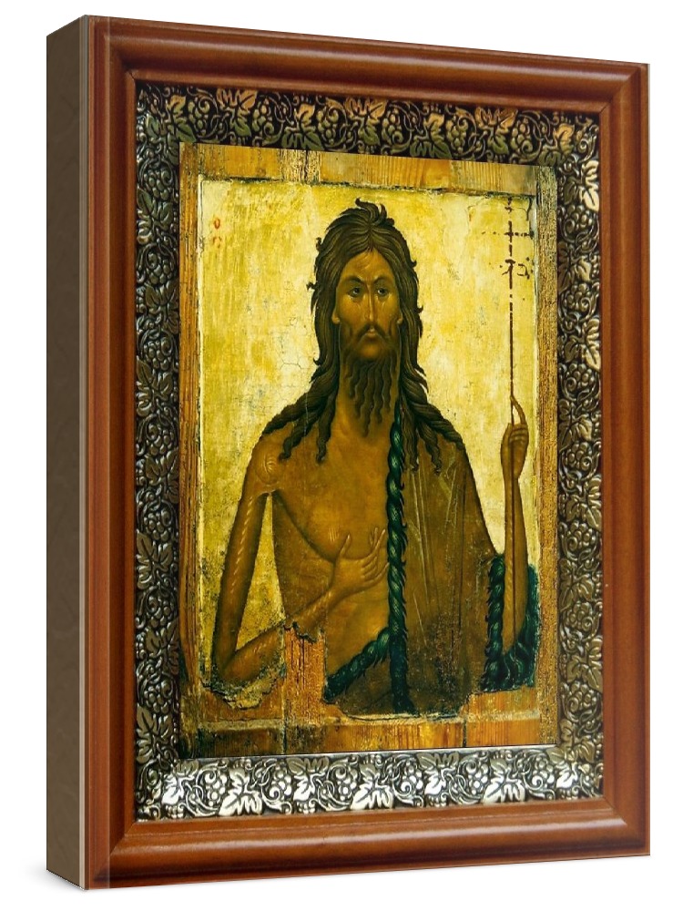 Икона иоанн предтеча (19х22), светлый киот. Икона выполняется на заказ. Срок изготовления - 2-5 дней. Лик нанесен методом шелкографии на цельную липовую доску, покрытую левкасом (специальным грунтом под живопись). Использованы минеральные (природные) краски. Размер иконы без киота (см): 13х16, с киотом: 19х22. Киот (рамка) выполнен из березы и украшен басмой (узор из черненой меди в виде виноградной лозы). Икона освящена.