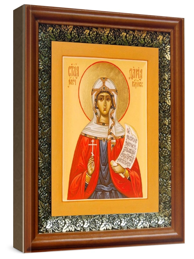 Икона дария римская (19х22), светлый киот. Икона выполняется на заказ. Срок изготовления - 2-5 дней. Лик нанесен методом шелкографии на цельную липовую доску, покрытую левкасом (специальным грунтом под живопись). Использованы минеральные (природные) краски. Размер иконы без киота (см): 13х16, с киотом: 19х22. Киот (рамка) выполнен из березы и украшен басмой (узор из черненой меди в виде виноградной лозы). Икона освящена.