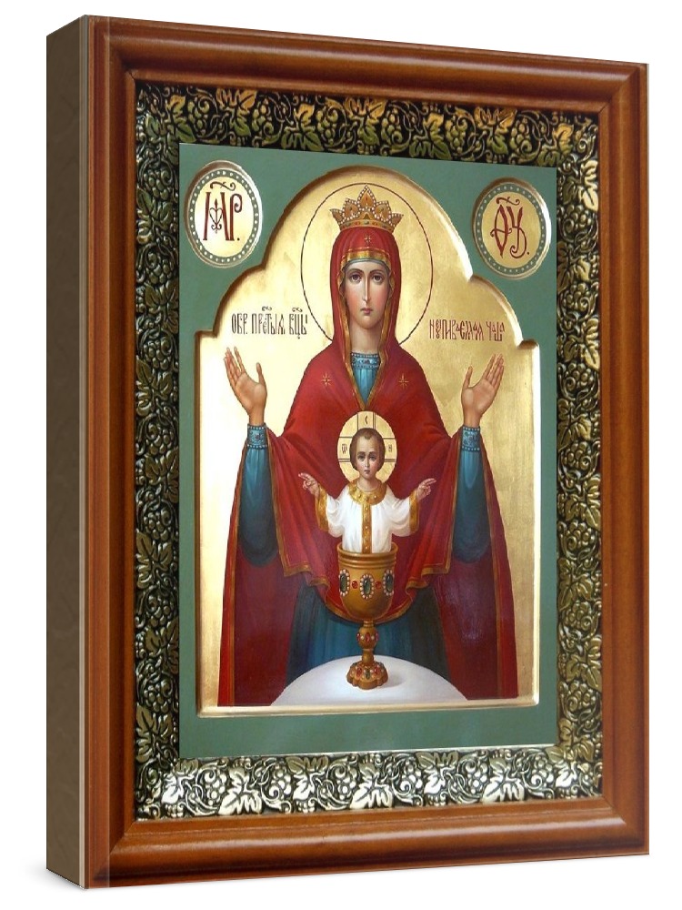 Икона неупиваемая чаша (19х22), светлый киот. Икона выполняется на заказ. Срок изготовления - 2-5 дней. Лик нанесен методом шелкографии на цельную липовую доску, покрытую левкасом (специальным грунтом под живопись). Использованы минеральные (природные) краски. Размер иконы без киота (см): 13х16, с киотом: 19х22. Киот (рамка) выполнен из березы и украшен басмой (узор из черненой меди в виде виноградной лозы). Икона освящена.
