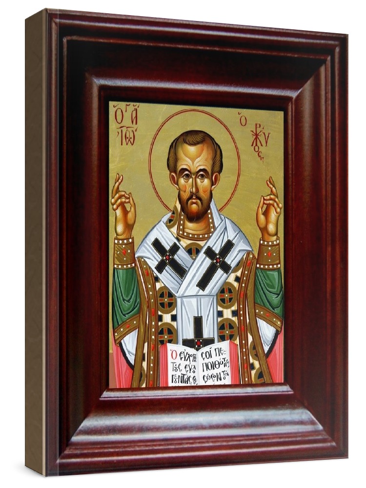 Икона иоанн златоуст (19х22), светлый киот. Икона выполняется на заказ. Срок изготовления - 2-5 дней. Лик нанесен методом шелкографии на цельную липовую доску, покрытую левкасом (специальным грунтом под живопись). Использованы минеральные (природные) краски. Размер иконы без киота (см): 13х16, с киотом: 19х22. Киот (рамка) выполнен из березы и украшен басмой (узор из черненой меди в виде виноградной лозы). Икона освящена.