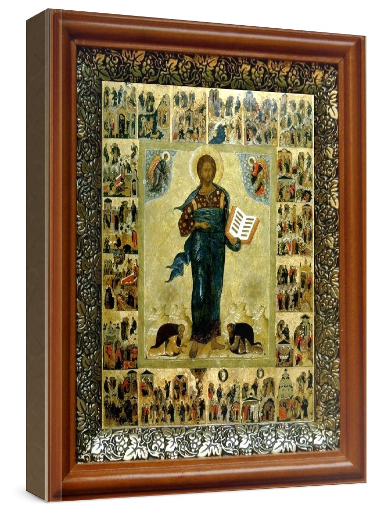 Икона спас смоленский (19х22), светлый киот. Икона выполняется на заказ. Срок изготовления - 2-5 дней. Лик нанесен методом шелкографии на цельную липовую доску, покрытую левкасом (специальным грунтом под живопись). Использованы минеральные (природные) краски. Размер иконы без киота (см): 13х16, с киотом: 19х22. Киот (рамка) выполнен из березы и украшен басмой (узор из черненой меди в виде виноградной лозы). Икона освящена.