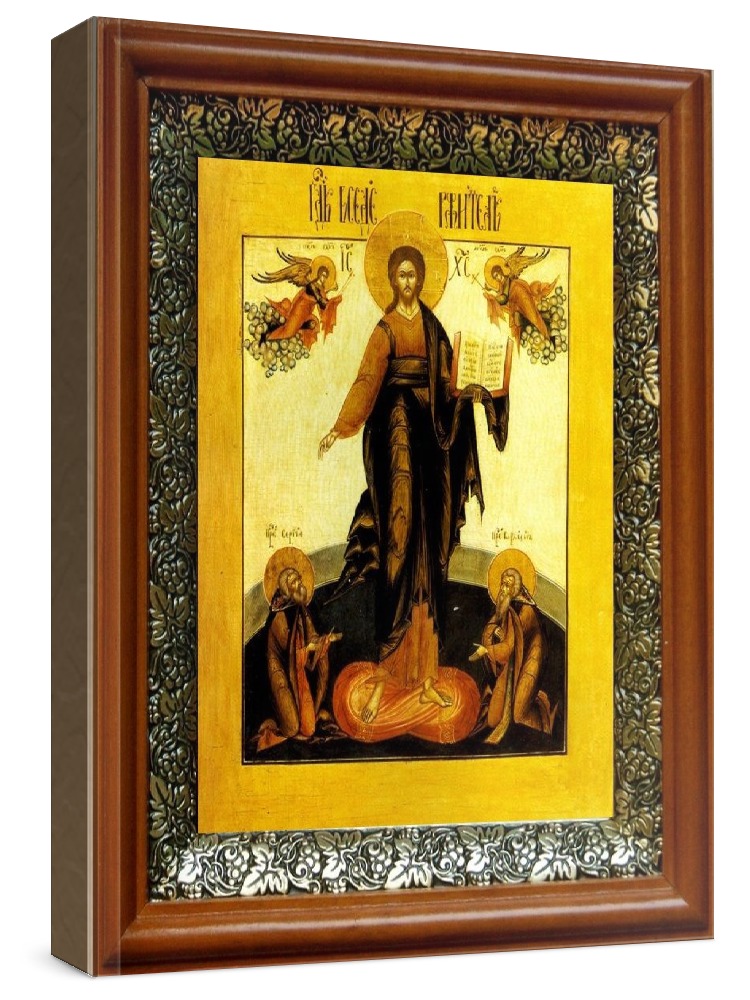 Икона спас смоленский (19х22), светлый киот. Икона выполняется на заказ. Срок изготовления - 2-5 дней. Лик нанесен методом шелкографии на цельную липовую доску, покрытую левкасом (специальным грунтом под живопись). Использованы минеральные (природные) краски. Размер иконы без киота (см): 13х16, с киотом: 19х22. Киот (рамка) выполнен из березы и украшен басмой (узор из черненой меди в виде виноградной лозы). Икона освящена.