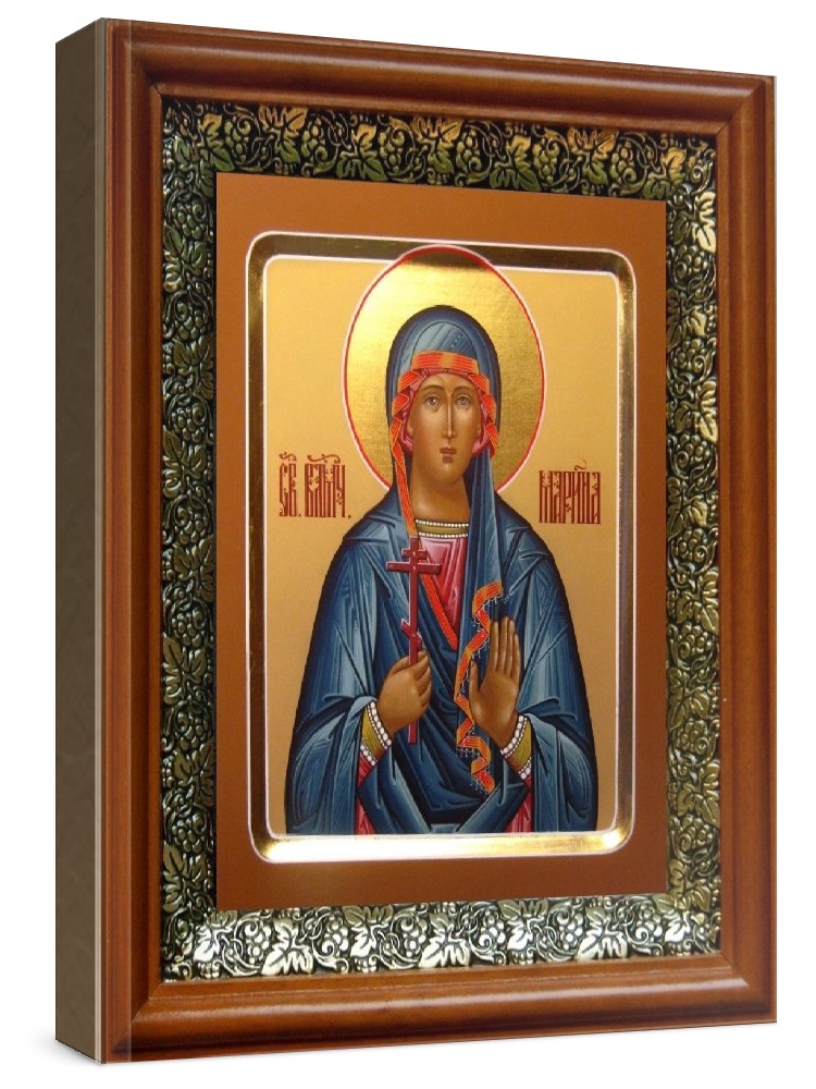 Икона марина антиохийская (19х22), светлый киот. Икона выполняется на заказ. Срок изготовления - 2-5 дней. Лик нанесен методом шелкографии на цельную липовую доску, покрытую левкасом (специальным грунтом под живопись). Использованы минеральные (природные) краски. Размер иконы без киота (см): 13х16, с киотом: 19х22. Киот (рамка) выполнен из березы и украшен басмой (узор из черненой меди в виде виноградной лозы). Икона освящена.