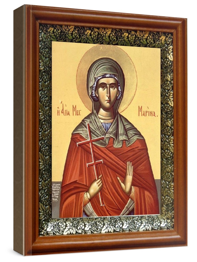 Икона марина антиохийская (19х22), светлый киот. Икона выполняется на заказ. Срок изготовления - 2-5 дней. Лик нанесен методом шелкографии на цельную липовую доску, покрытую левкасом (специальным грунтом под живопись). Использованы минеральные (природные) краски. Размер иконы без киота (см): 13х16, с киотом: 19х22. Киот (рамка) выполнен из березы и украшен басмой (узор из черненой меди в виде виноградной лозы). Икона освящена.