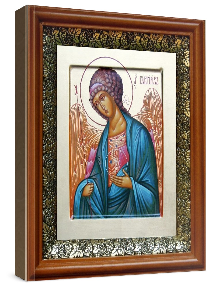 Икона гавриил архангел (19х22), светлый киот. Лик нанесен методом шелкографии на цельную липовую доску, покрытую левкасом (специальным грунтом под живопись). Использованы минеральные (природные) краски. Размер иконы без киота (см): 13х16, с киотом: 19х22. Киот со стеклом, выполнен из березы и украшен басмой (узор из черненой меди в виде виноградной лозы). Икона освящена.