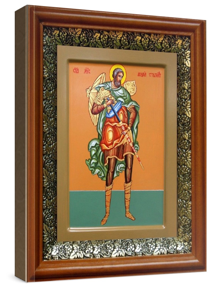 Икона андрей стратилат (19х22), светлый киот. Лик нанесен методом шелкографии на цельную липовую доску, покрытую левкасом (специальным грунтом под живопись). Использованы минеральные (природные) краски. Размер иконы без киота (см): 13х16, с киотом: 19х22. Киот со стеклом, выполнен из березы и украшен басмой (узор из черненой меди в виде виноградной лозы). Икона освящена.
