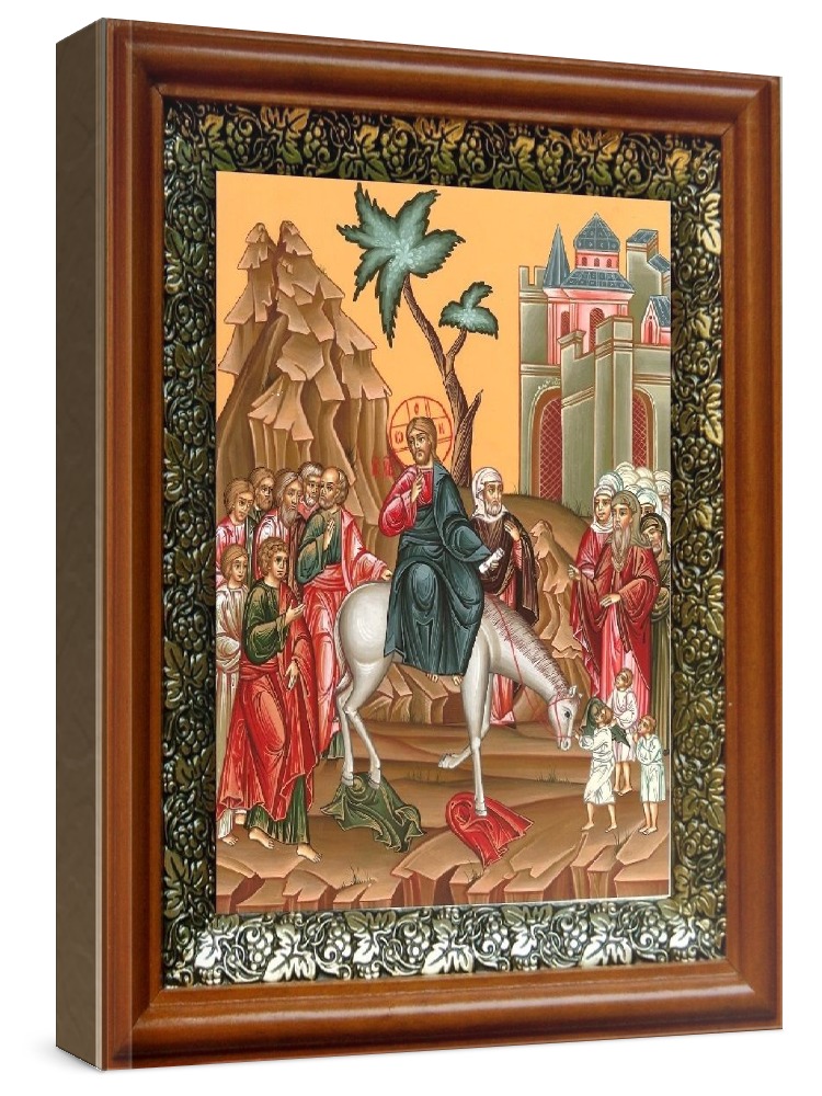 Икона вход господень в иерусалим (19х22), светлый киот. Лик нанесен методом шелкографии на цельную липовую доску, покрытую левкасом (специальным грунтом под живопись). Использованы минеральные (природные) краски. Размер иконы без киота (см): 13х16, с киотом: 19х22. Киот со стеклом, выполнен из березы и украшен басмой (узор из черненой меди в виде виноградной лозы). Икона освящена.