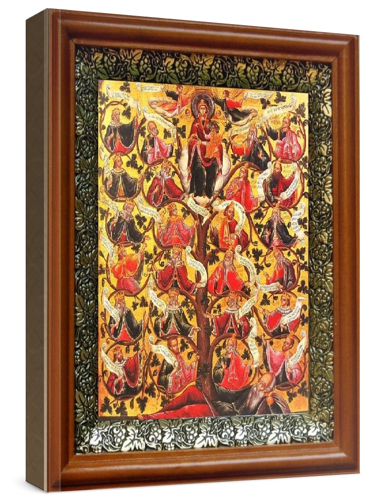 Икона древо иессеево (19х22), светлый киот. Лик нанесен методом шелкографии на цельную липовую доску, покрытую левкасом (специальным грунтом под живопись). Использованы минеральные (природные) краски. Размер иконы без киота (см): 13х16, с киотом: 19х22. Киот (рамка) выполнен из березы и украшен басмой (узор из черненой меди в виде виноградной лозы). Икона освящена.