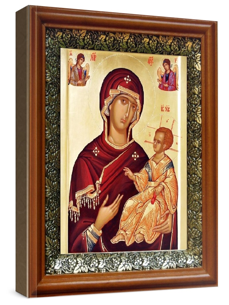 Икона душеспасительница (психосострия) (19х22), светлый киот. Лик нанесен методом шелкографии на цельную липовую доску, покрытую левкасом (специальным грунтом под живопись). Использованы минеральные (природные) краски. Размер иконы без киота (см): 13х16, с киотом: 19х22. Киот (рамка) выполнен из березы и украшен басмой (узор из черненой меди в виде виноградной лозы). Икона освящена.