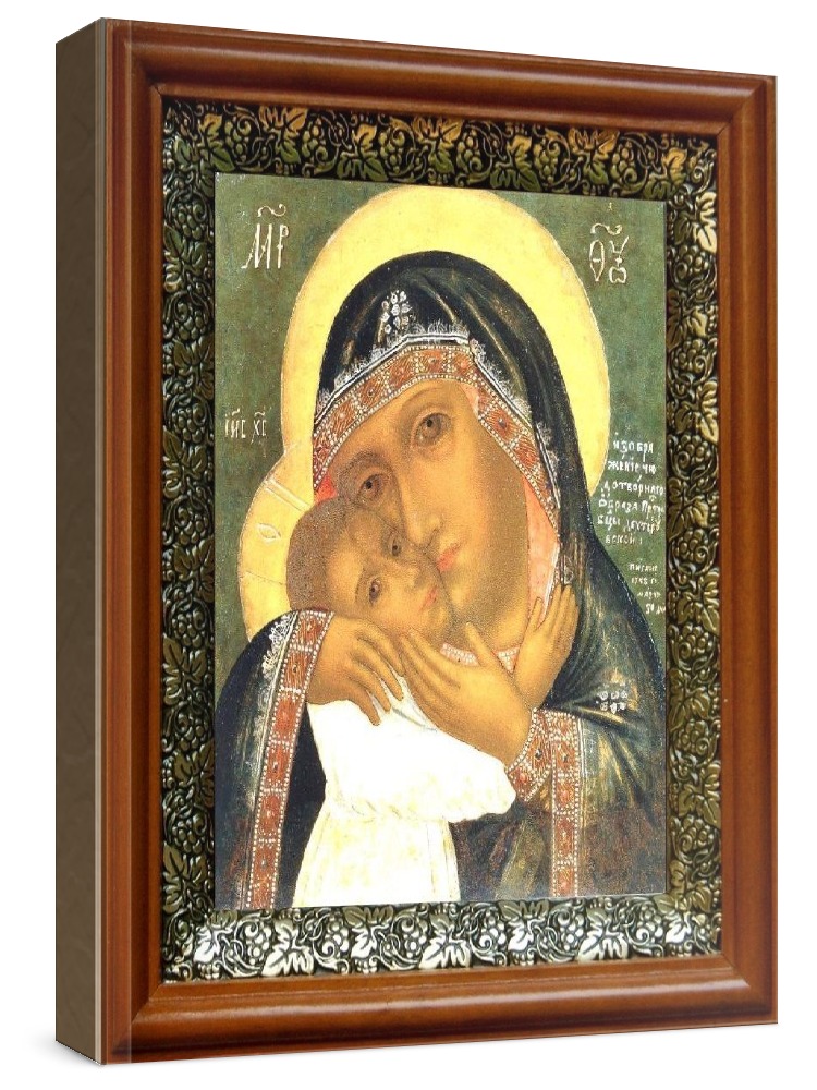 Девпетерувская икона бм (19х22), светлый киот. Лик нанесен методом шелкографии на цельную липовую доску, покрытую левкасом (специальным грунтом под живопись). Использованы минеральные (природные) краски. Размер иконы без киота (см): 13х16, с киотом: 19х22. Киот (рамка) выполнен из березы и украшен басмой (узор из черненой меди в виде виноградной лозы). Икона освящена.