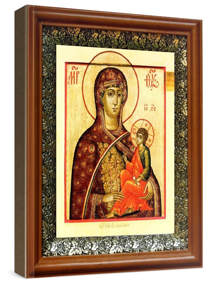 Молченская икона бм (19х22), светлый киот. Лик нанесен методом шелкографии на цельную липовую доску, покрытую левкасом (специальным грунтом под живопись). Использованы минеральные (природные) краски. Размер иконы без киота (см): 13х16, с киотом: 19х22. Киот со стеклом, выполнен из березы и украшен басмой (узор из черненой меди в виде виноградной лозы). Икона освящена.