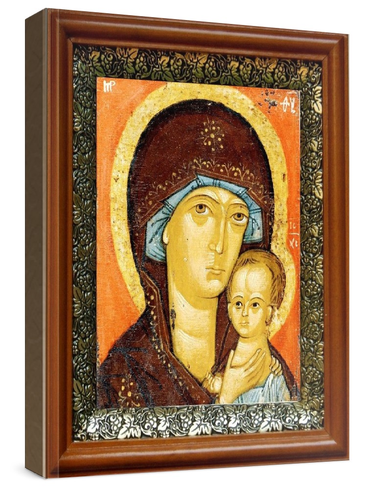 Петровская икона бм (19х22), светлый киот.     Лик нанесен методом шелкографии на цельную липовую доску, покрытую левкасом (специальным грунтом под живопись). Использованы минеральные (природные) краски.  Размер иконы без киота (см): 13х16, с киотом: 19х22.  Киот со стеклом, выполнен из березы и украшен басмой (узор из черненой меди в виде виноградной лозы).  Икона освящена.