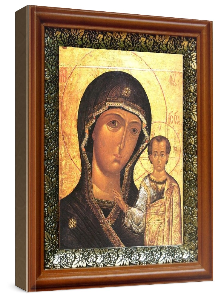 Петровская икона бм (19х22), светлый киот. Лик нанесен методом шелкографии на цельную липовую доску, покрытую левкасом (специальным грунтом под живопись). Использованы минеральные (природные) краски. Размер иконы без киота (см): 13х16, с киотом: 19х22. Киот со стеклом, выполнен из березы и украшен басмой (узор из черненой меди в виде виноградной лозы). Икона освящена.