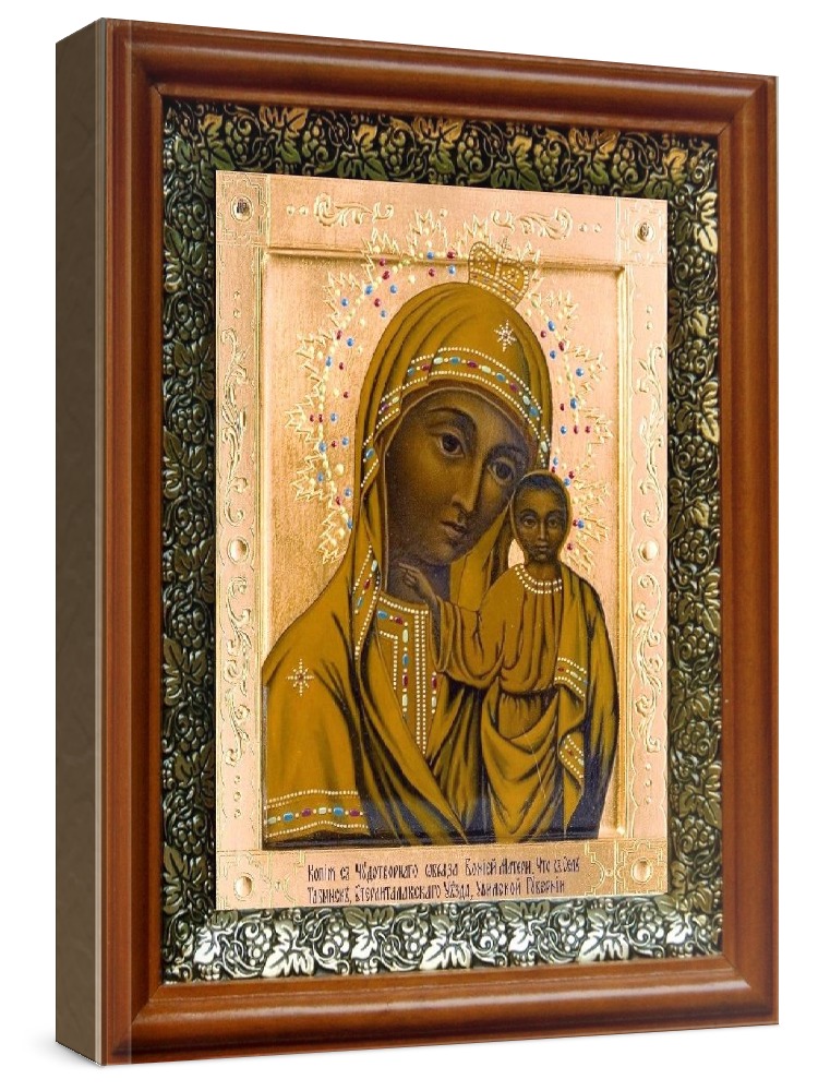 Табынская икона бм (19х22), светлый киот. Лик нанесен методом шелкографии на цельную липовую доску, покрытую левкасом (специальным грунтом под живопись). Использованы минеральные (природные) краски. Размер иконы без киота (см): 13х16, с киотом: 19х22. Киот со стеклом, выполнен из березы и украшен басмой (узор из черненой меди в виде виноградной лозы). Икона освящена.
