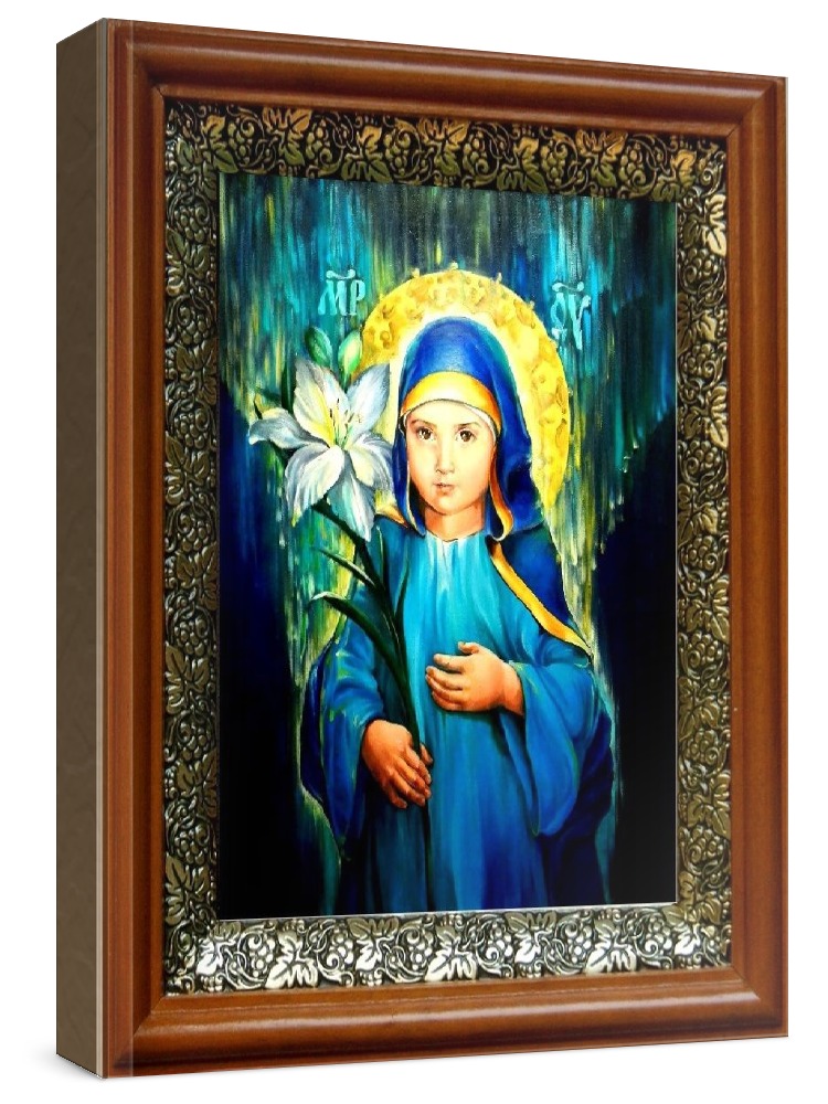 Трилетствующая икона бм (19х22), светлый киот. Лик нанесен методом шелкографии на цельную липовую доску, покрытую левкасом (специальным грунтом под живопись). Использованы минеральные (природные) краски. Размер иконы без киота (см): 13х16, с киотом: 19х22. Киот со стеклом, выполнен из березы и украшен басмой (узор из черненой меди в виде виноградной лозы). Икона освящена.