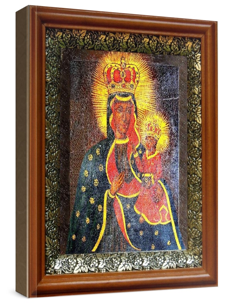 Тывровская икона бм (19х22), светлый киот. Лик нанесен методом шелкографии на цельную липовую доску, покрытую левкасом (специальным грунтом под живопись). Использованы минеральные (природные) краски. Размер иконы без киота (см): 13х16, с киотом: 19х22. Киот со стеклом, выполнен из березы и украшен басмой (узор из черненой меди в виде виноградной лозы). Икона освящена.