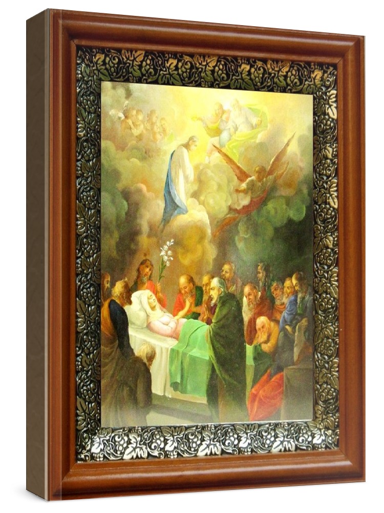 Икона успение пресвятой богородицы (19х22), светлый киот. Лик нанесен методом шелкографии на цельную липовую доску, покрытую левкасом (специальным грунтом под живопись). Использованы минеральные (природные) краски. Размер иконы без киота (см): 13х16, с киотом: 19х22. Киот со стеклом, выполнен из березы и украшен басмой (узор из черненой меди в виде виноградной лозы). Икона освящена.