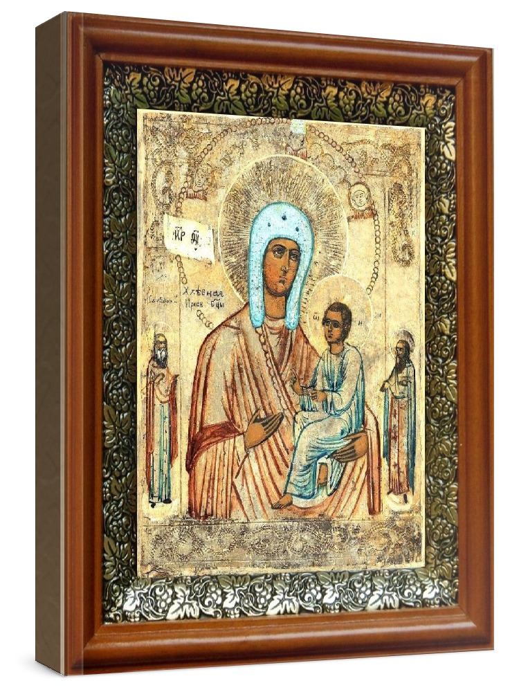 Хлебная икона бм (19х22), светлый киот. Лик нанесен методом шелкографии на цельную липовую доску, покрытую левкасом (специальным грунтом под живопись). Использованы минеральные (природные) краски. Размер иконы без киота (см): 13х16, с киотом: 19х22. Киот со стеклом, выполнен из березы и украшен басмой (узор из черненой меди в виде виноградной лозы). Икона освящена.