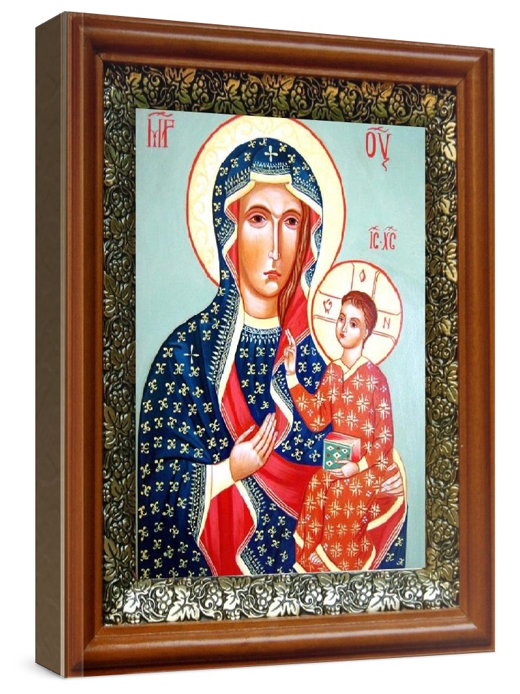 Ченстоховская икона бм (19х22), светлый киот. Лик нанесен методом шелкографии на цельную липовую доску, покрытую левкасом (специальным грунтом под живопись). Использованы минеральные (природные) краски. Размер иконы без киота (см): 13х16, с киотом: 19х22. Киот со стеклом, выполнен из березы и украшен басмой (узор из черненой меди в виде виноградной лозы). Икона освящена.