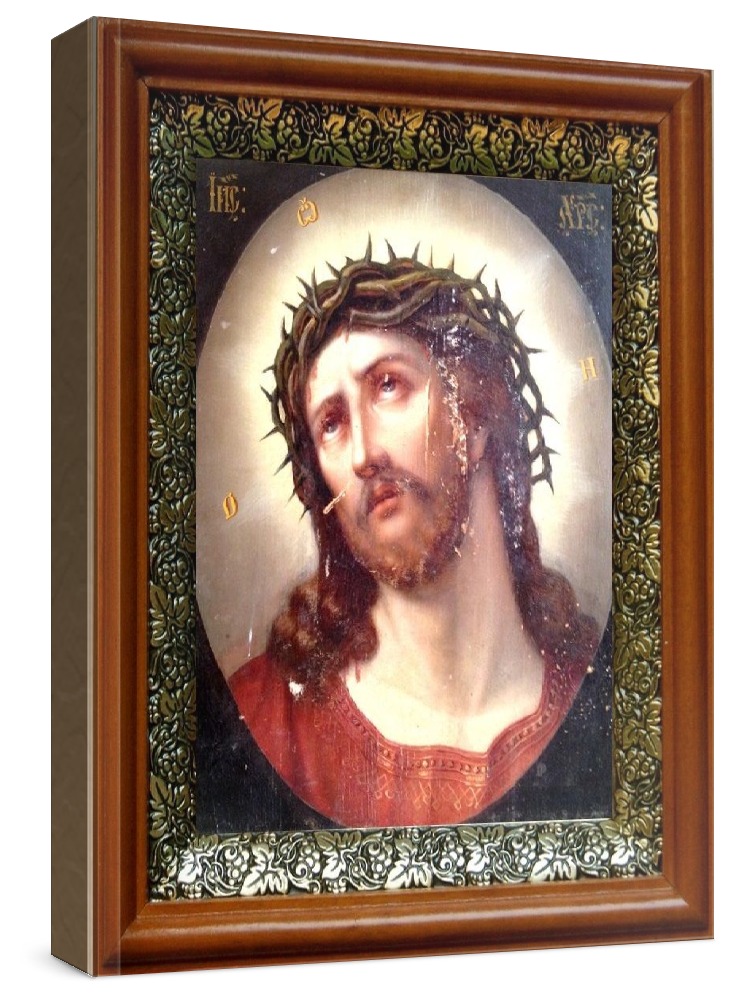 Икона спас в терновом венце (19х22), светлый киот. Лик нанесен методом шелкографии на цельную липовую доску, покрытую левкасом (специальным грунтом под живопись). Использованы минеральные (природные) краски. Размер иконы без киота (см): 13х16, с киотом: 19х22. Киот со стеклом, выполнен из березы и украшен басмой (узор из черненой меди в виде виноградной лозы). Икона освящена.