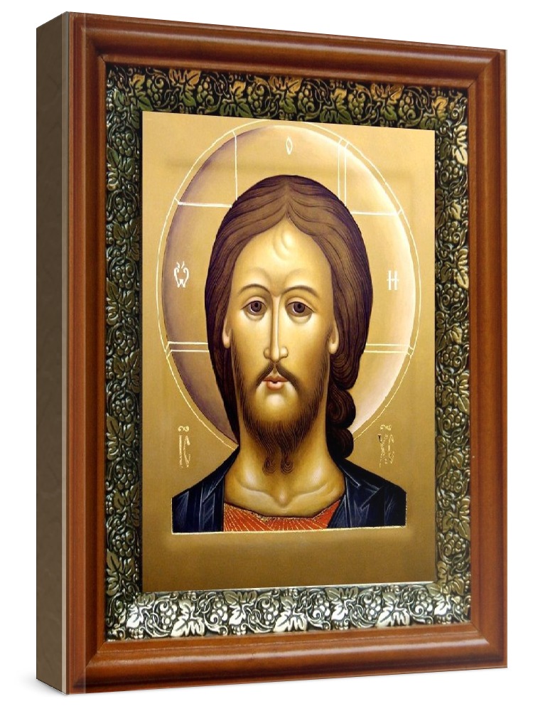Икона спас оплечный (19х22), светлый киот. Лик нанесен методом шелкографии на цельную липовую доску, покрытую левкасом (специальным грунтом под живопись). Использованы минеральные (природные) краски. Размер иконы без киота (см): 13х16, с киотом: 19х22. Киот со стеклом, выполнен из березы и украшен басмой (узор из черненой меди в виде виноградной лозы). Икона освящена.