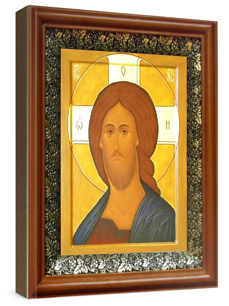Икона спас оплечный (19х22), светлый киот. Лик нанесен методом шелкографии на цельную липовую доску, покрытую левкасом (специальным грунтом под живопись). Использованы минеральные (природные) краски. Размер иконы без киота (см): 13х16, с киотом: 19х22. Киот со стеклом, выполнен из березы и украшен басмой (узор из черненой меди в виде виноградной лозы). Икона освящена.