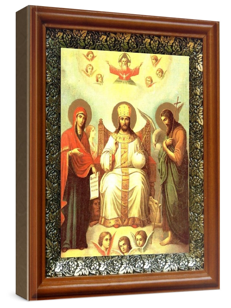 Икона царь царем (19х22), светлый киот. Лик нанесен методом шелкографии на цельную липовую доску, покрытую левкасом (специальным грунтом под живопись). Использованы минеральные (природные) краски. Размер иконы без киота (см): 13х16, с киотом: 19х22. Киот со стеклом, выполнен из березы и украшен басмой (узор из черненой меди в виде виноградной лозы). Икона освящена.
