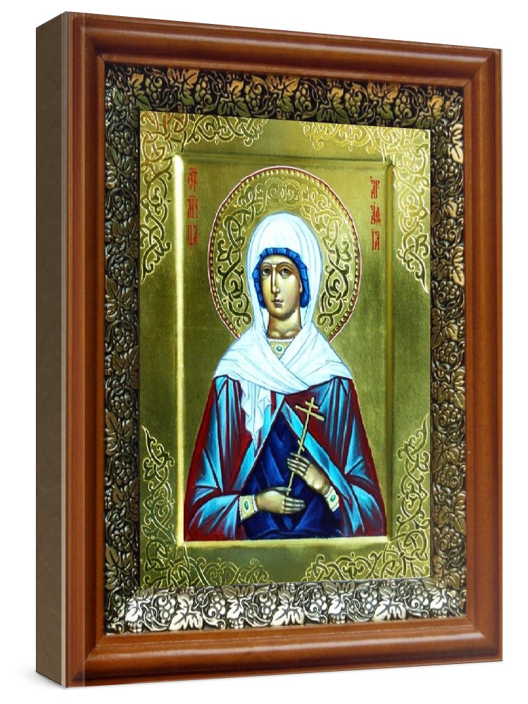 Икона агафия никомидийская (19х22), светлый киот. Лик нанесен методом шелкографии на цельную липовую доску, покрытую левкасом (специальным грунтом под живопись). Использованы минеральные (природные) краски. Размер иконы без киота (см): 13х16, с киотом: 19х22. Киот со стеклом, выполнен из березы и украшен басмой (узор из черненой меди в виде виноградной лозы). Икона освящена.