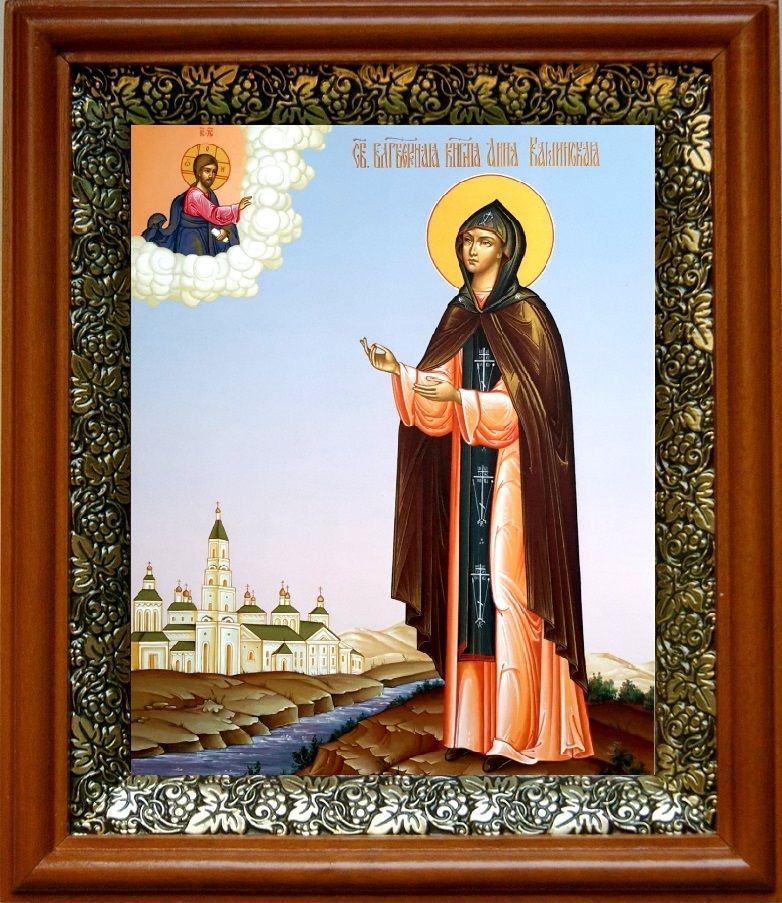 Икона анна кашинская (19х22), светлый киот. Лик нанесен методом шелкографии на цельную липовую доску, покрытую левкасом (специальным грунтом под живопись). Использованы минеральные (природные) краски. Размер иконы без киота (см): 13х16, с киотом: 19х22. Киот со стеклом, выполнен из березы и украшен басмой (узор из черненой меди в виде виноградной лозы). Икона освящена.