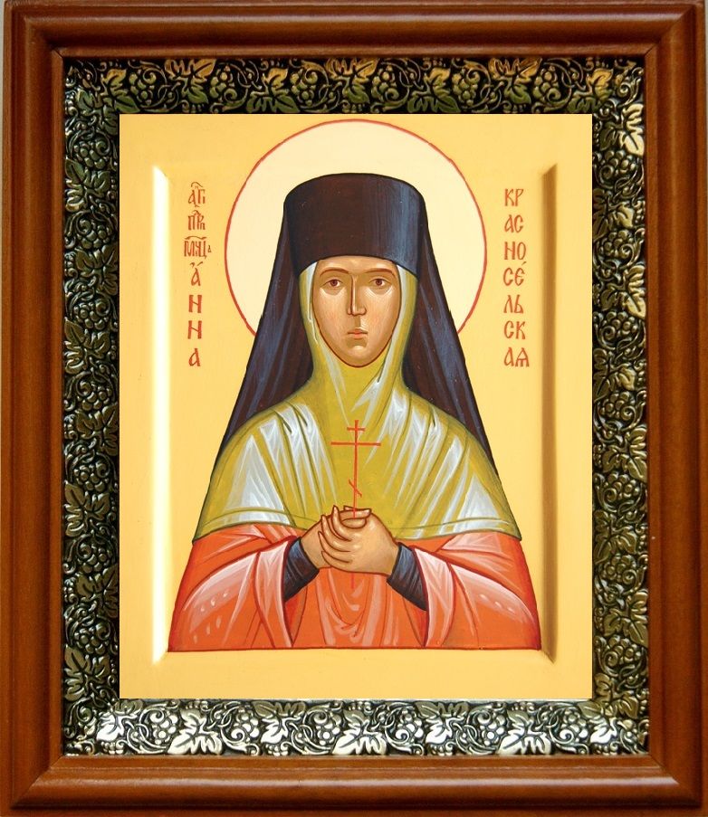 Икона анна макандина (19х22), светлый киот. Лик нанесен методом шелкографии на цельную липовую доску, покрытую левкасом (специальным грунтом под живопись). Использованы минеральные (природные) краски. Размер иконы без киота (см): 13х16, с киотом: 19х22. Киот со стеклом, выполнен из березы и украшен басмой (узор из черненой меди в виде виноградной лозы). Икона освящена.