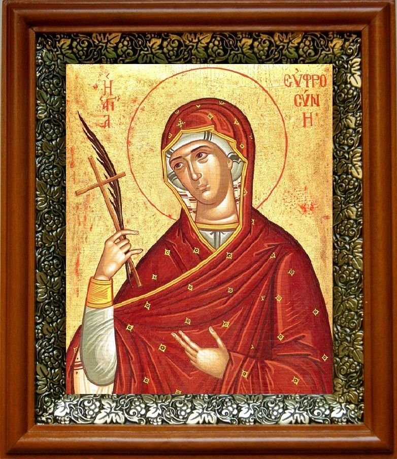 Икона евфросиния александрийская (19х22), светлый киот. Лик нанесен методом шелкографии на цельную липовую доску, покрытую левкасом (специальным грунтом под живопись). Использованы минеральные (природные) краски. Размер иконы без киота (см): 13х16, с киотом: 19х22. Киот со стеклом, выполнен из березы и украшен басмой (узор из черненой меди в виде виноградной лозы). Икона освящена.