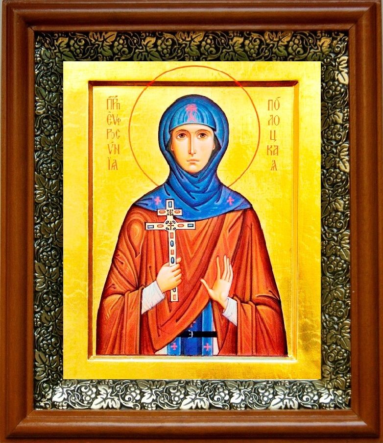 Икона евфросиния полоцкая (19х22), светлый киот. Лик нанесен методом шелкографии на цельную липовую доску, покрытую левкасом (специальным грунтом под живопись). Использованы минеральные (природные) краски. Размер иконы без киота (см): 13х16, с киотом: 19х22. Киот со стеклом, выполнен из березы и украшен басмой (узор из черненой меди в виде виноградной лозы). Икона освящена.