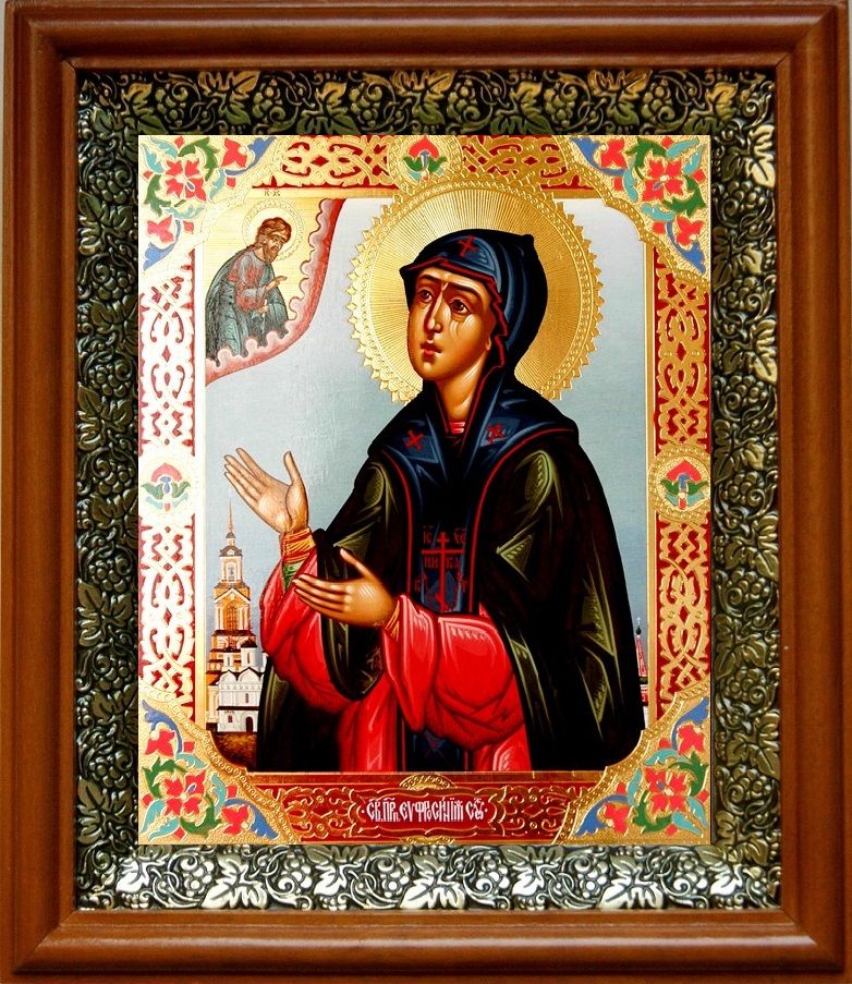 Икона евфросиния суздальская (19х22), светлый киот. Лик нанесен методом шелкографии на цельную липовую доску, покрытую левкасом (специальным грунтом под живопись). Использованы минеральные (природные) краски. Размер иконы без киота (см): 13х16, с киотом: 19х22. Киот со стеклом, выполнен из березы и украшен басмой (узор из черненой меди в виде виноградной лозы). Икона освящена.