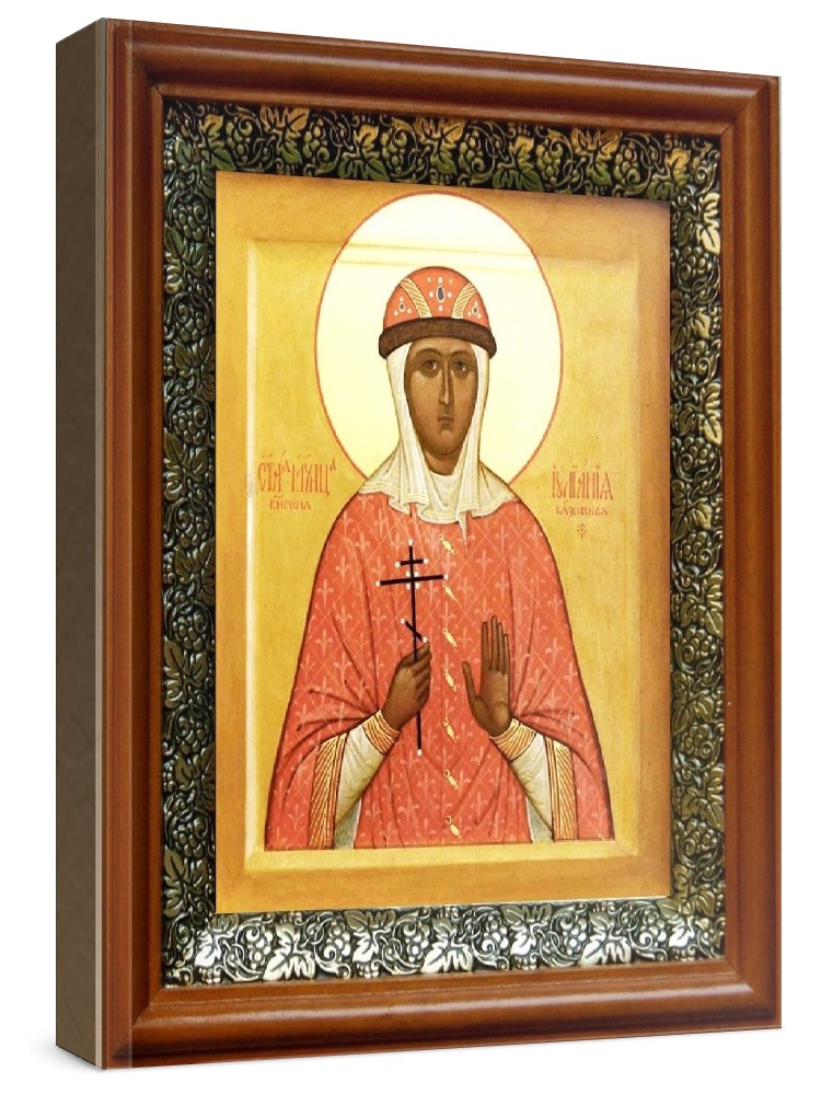 Икона иулиания лазаревская (19х22), светлый киот. Лик нанесен методом шелкографии на цельную липовую доску, покрытую левкасом (специальным грунтом под живопись). Использованы минеральные (природные) краски. Размер иконы без киота (см): 13х16, с киотом: 19х22. Киот со стеклом, выполнен из березы и украшен басмой (узор из черненой меди в виде виноградной лозы). Икона освящена.