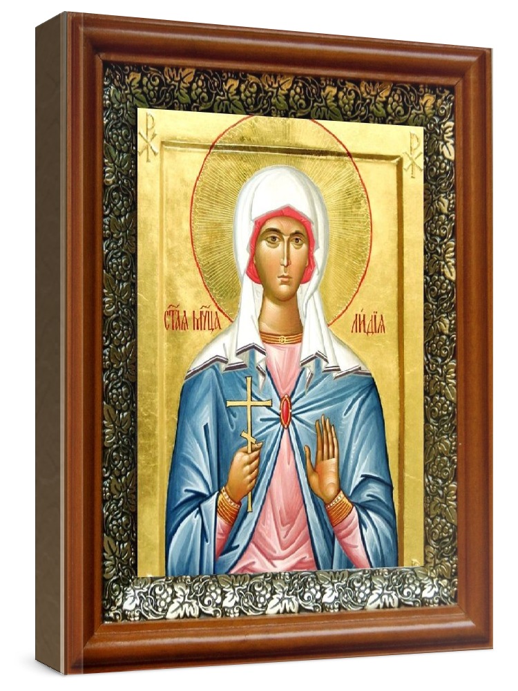 Икона лидия иллирийская (19х22), светлый киот. Лик нанесен методом шелкографии на цельную липовую доску, покрытую левкасом (специальным грунтом под живопись). Использованы минеральные (природные) краски. Размер иконы без киота (см): 13х16, с киотом: 19х22. Киот со стеклом, выполнен из березы и украшен басмой (узор из черненой меди в виде виноградной лозы). Икона освящена.
