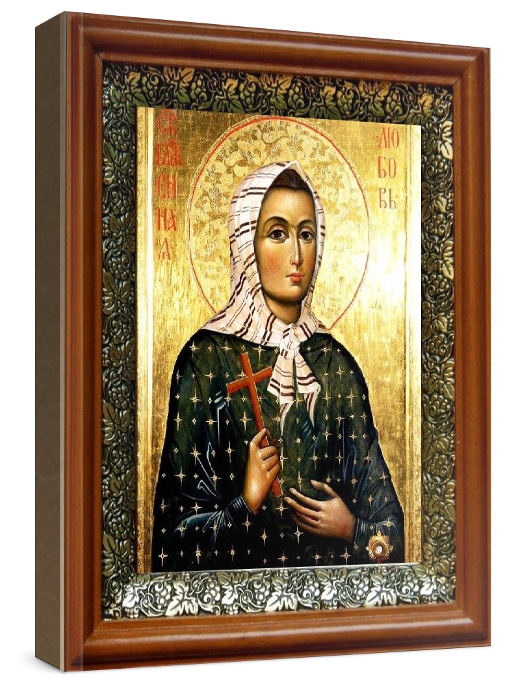 Икона любовь рязанская (19х22), светлый киот. Лик нанесен методом шелкографии на цельную липовую доску, покрытую левкасом (специальным грунтом под живопись). Использованы минеральные (природные) краски. Размер иконы без киота (см): 13х16, с киотом: 19х22. Киот со стеклом, выполнен из березы и украшен басмой (узор из черненой меди в виде виноградной лозы). Икона освящена.