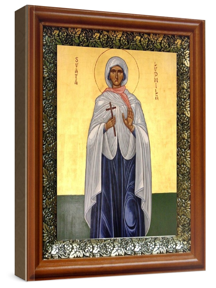 Икона людмила петрова (19х22), светлый киот. Лик нанесен методом шелкографии на цельную липовую доску, покрытую левкасом (специальным грунтом под живопись). Использованы минеральные (природные) краски. Размер иконы без киота (см): 13х16, с киотом: 19х22. Киот со стеклом, выполнен из березы и украшен басмой (узор из черненой меди в виде виноградной лозы). Икона освящена.