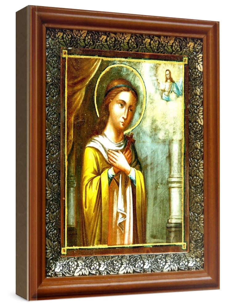 Икона мария азийская (19х22), светлый киот. Лик нанесен методом шелкографии на цельную липовую доску, покрытую левкасом (специальным грунтом под живопись). Использованы минеральные (природные) краски. Размер иконы без киота (см): 13х16, с киотом: 19х22. Киот со стеклом, выполнен из березы и украшен басмой (узор из черненой меди в виде виноградной лозы). Икона освящена.