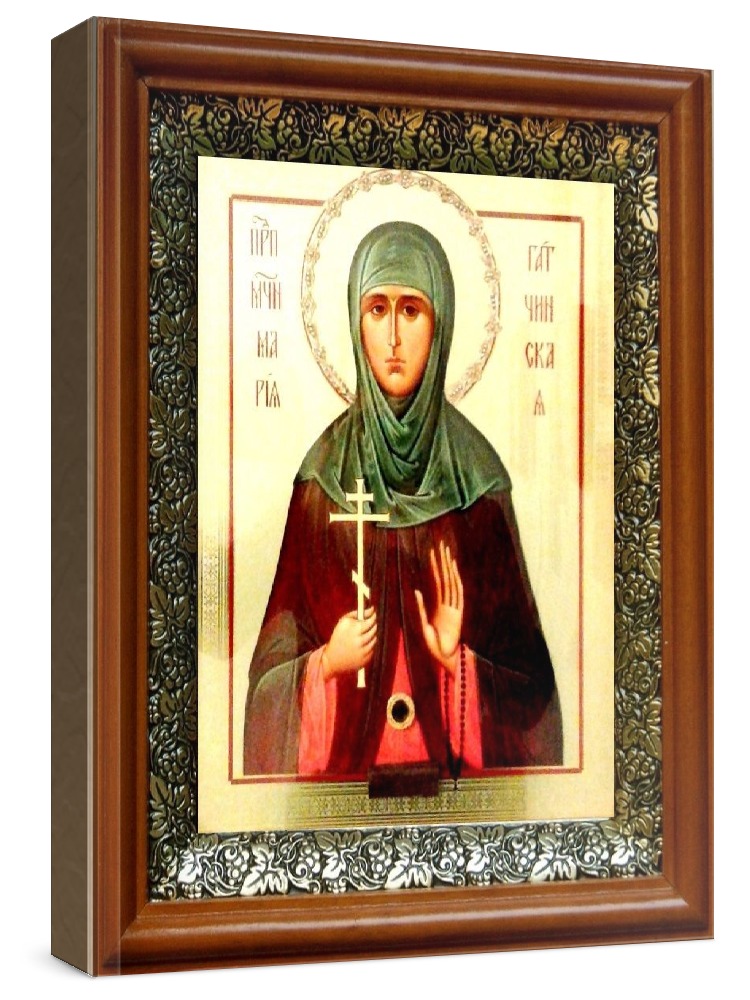 Икона мария гатчинская (19х22), светлый киот. Лик нанесен методом шелкографии на цельную липовую доску, покрытую левкасом (специальным грунтом под живопись). Использованы минеральные (природные) краски. Размер иконы без киота (см): 13х16, с киотом: 19х22. Киот со стеклом, выполнен из березы и украшен басмой (узор из черненой меди в виде виноградной лозы). Икона освящена.