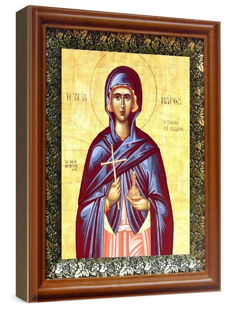 Икона марфа вифанская (19х22), светлый киот. Лик нанесен методом шелкографии на цельную липовую доску, покрытую левкасом (специальным грунтом под живопись). Использованы минеральные (природные) краски. Размер иконы без киота (см): 13х16, с киотом: 19х22. Киот со стеклом, выполнен из березы и украшен басмой (узор из черненой меди в виде виноградной лозы). Икона освящена.