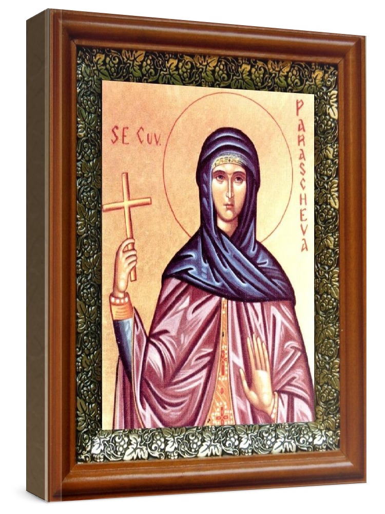Икона параскева петка сербская (19х22), светлый киот. Лик нанесен методом шелкографии на цельную липовую доску, покрытую левкасом (специальным грунтом под живопись). Использованы минеральные (природные) краски. Размер иконы без киота (см): 13х16, с киотом: 19х22. Киот со стеклом, выполнен из березы и украшен басмой (узор из черненой меди в виде виноградной лозы). Икона освящена.