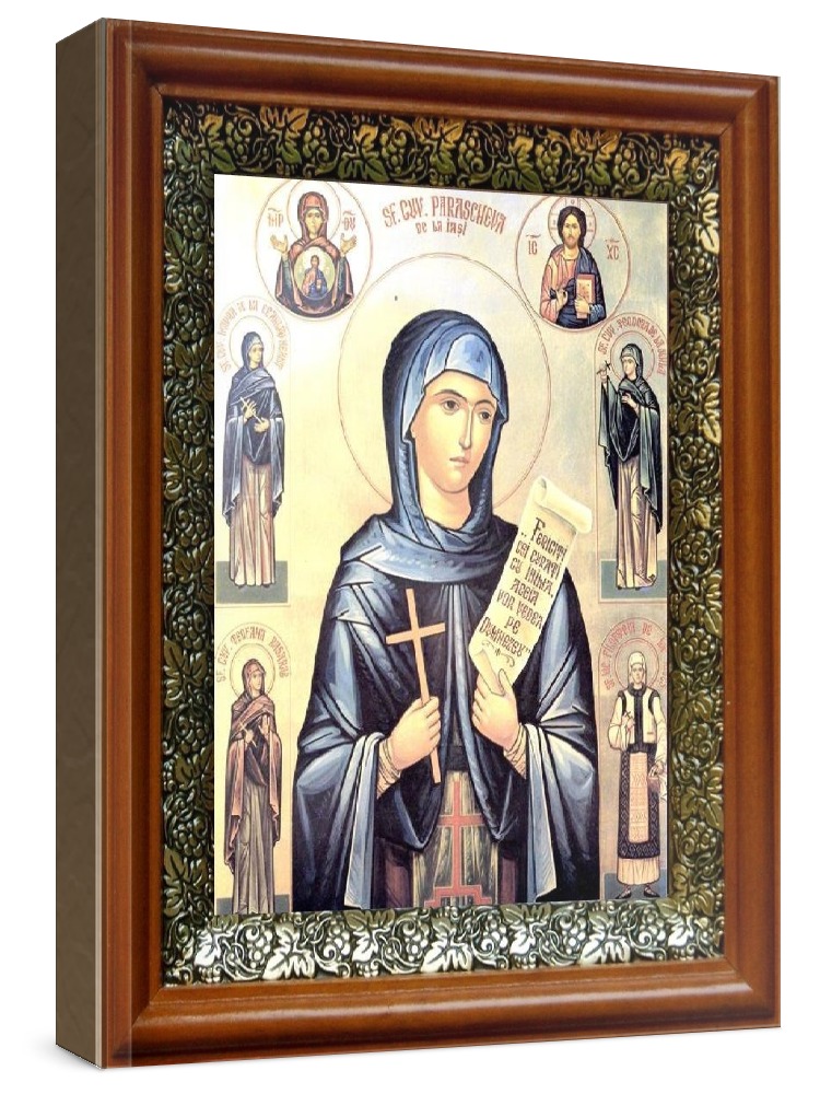 Икона параскева петка сербская (19х22), светлый киот. Лик нанесен методом шелкографии на цельную липовую доску, покрытую левкасом (специальным грунтом под живопись). Использованы минеральные (природные) краски. Размер иконы без киота (см): 13х16, с киотом: 19х22. Киот со стеклом, выполнен из березы и украшен басмой (узор из черненой меди в виде виноградной лозы). Икона освящена.